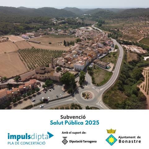 L 'Ajuntament de Bonastre ha rebut una subvenció de la Diputació de Tarragona, dins de la convocatòria Pla ImpulsDipta, per Salut Pública de l'exercici 2025, per l'import de 17.032,65 euros. Les actuacions que s'han realitzat han estat les següents: Analítiques pel control de la qualitat de l'aigua...